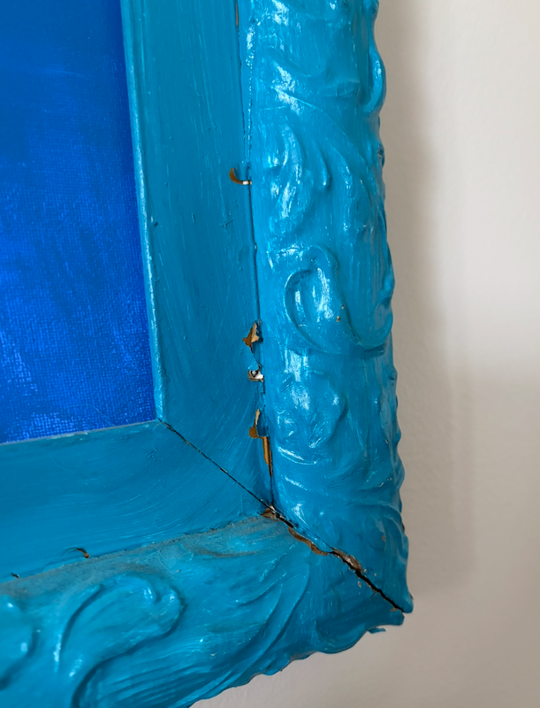 Frame: Bevelled wood frame - painted teal - rustic wear and tear